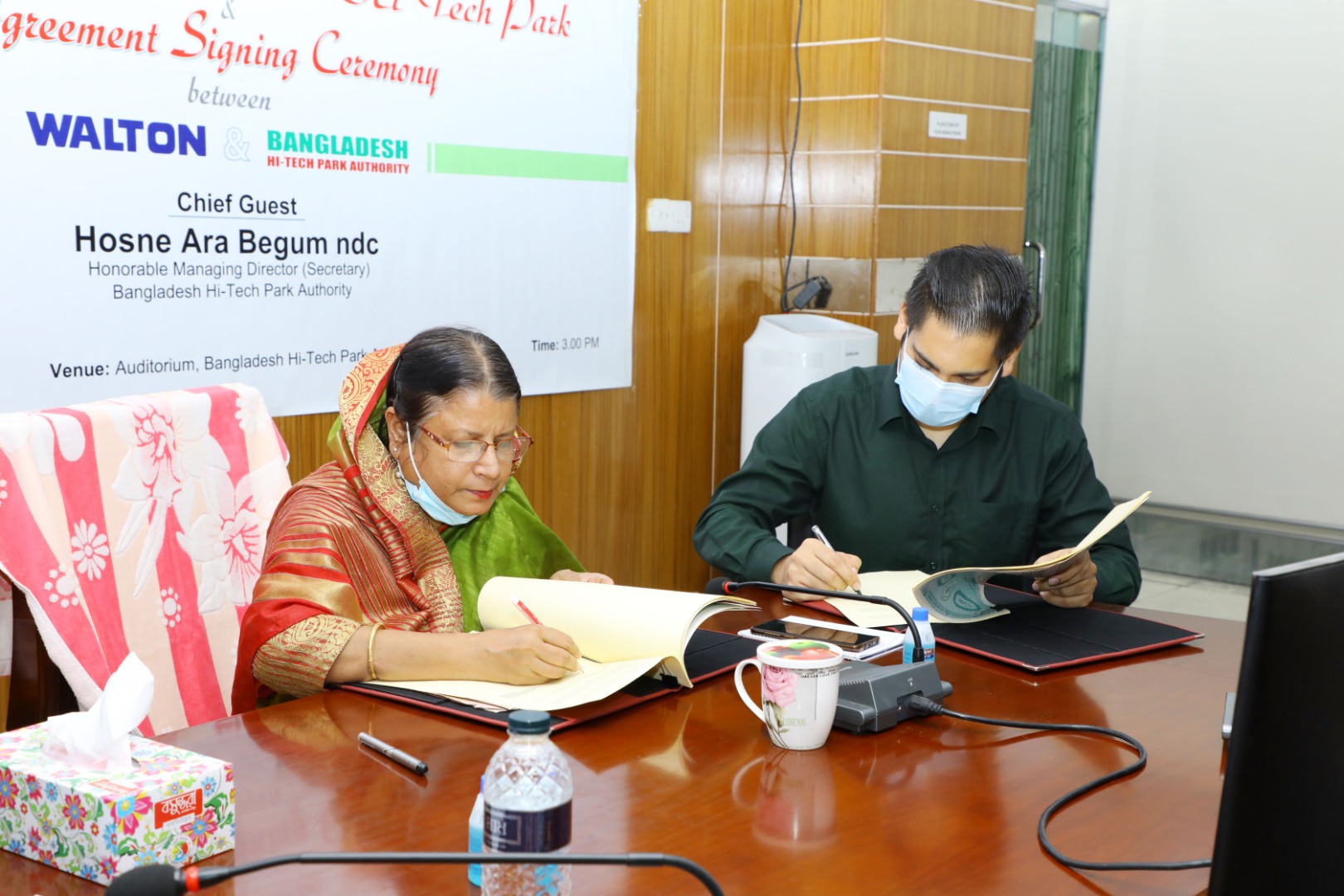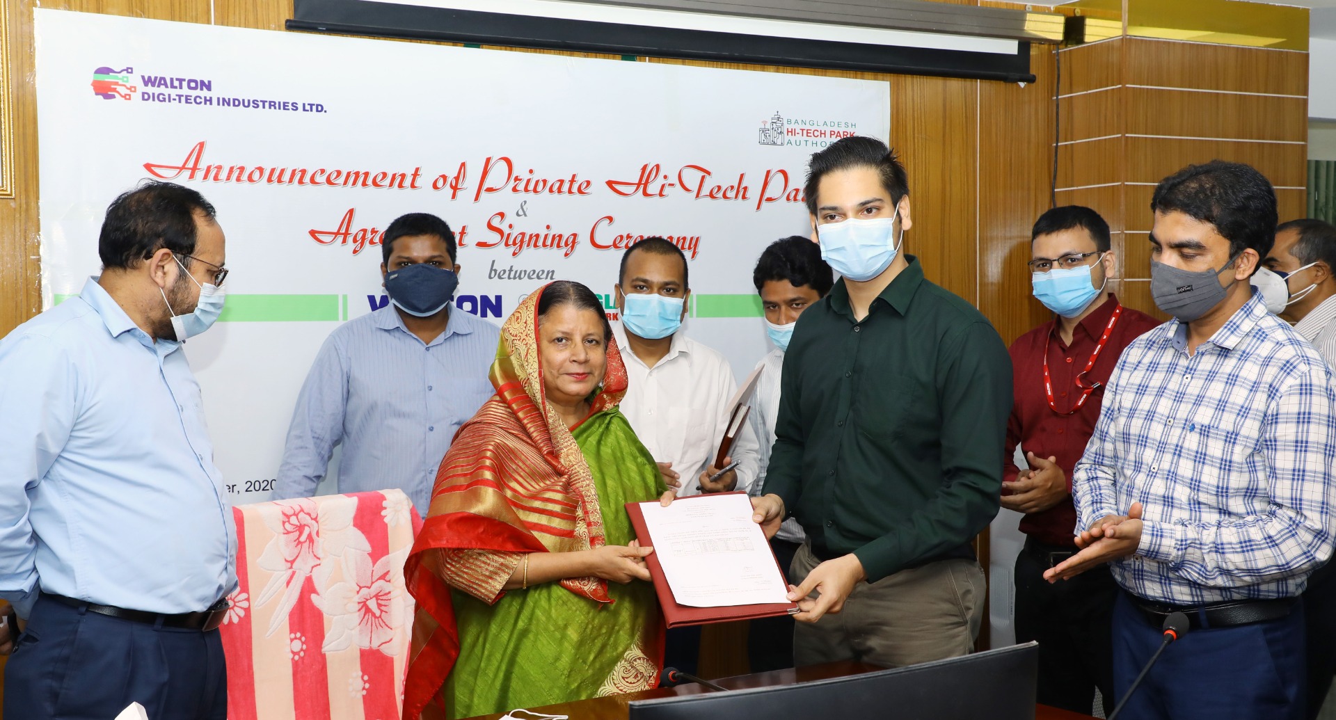 | হাই-টেক সিটি, কালিয়াকৈরে ওয়ালটনকে ০৩ একর জমি বরাদ্দ দিয়েছে বাংলাদেশ হাই-টেক পার্ক কর্তৃপক্ষ। একই সাথে ওয়ালটন ডিজি-টেক ইন্ডাস্ট্রিজ লিমিটেডকে বেসরকারি হাই-টেক পার্ক হিসেবে ঘোষণা করা হয়েছে। ৯ সেপ্টেম্বর ২০২০ বাংলাদেশ হাই-টেক পার্ক কর্তৃপক্ষ এবং ওয়ালটন ডিজি-টেক ইন্ডাস্ট্রিজ লিমিটেডের মধ্যে এ বিষয়ে চুক্তি স্বাক্ষরিত হয়েছে। রাজধানীর আগারগাঁওয়ে বাংলাদেশ হাই-টেক পার্ক কর্তৃপক্ষের সভাকক্ষে উক্ত চুক্তিতে স্বাক্ষর করেন বাংলাদেশ হাই-টেক পার্ক কর্তৃপক্ষের ব্যবস্থাপনা পরিচালক (সচিব) জনাব হোসনে আরা বেগম এনডিসি এবং ওয়ালটন ডিজি-টেক ইন্ডাস্ট্রিজ লিমিটেডের ব্যবস্থাপনা পরিচালক এস এম মঞ্জুরুল আলম। |